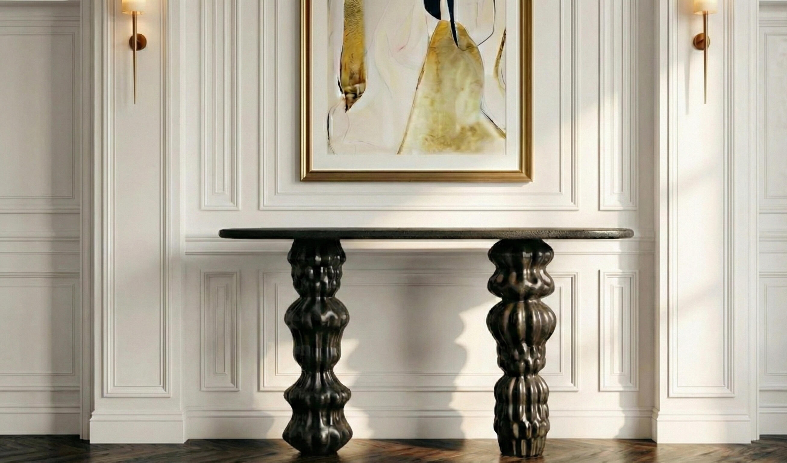 Deep NoirA study in shadow and silhouette. The Deep Noir console absorbs light to reveal form, relying on the interplay of soft highlights across its ribbed, sculptural legs. It stands as a dark anchor, grounding the airiness of the surrounding space with a tactile elegance.Ornamental yet restrained, classical yet unmistakably contemporary, the table occupies a rare balance between presence and poise. Its sculptural base introduces depth and rhythm without excess, drawing from classical proportions while reinterpreting them through a modern, pared-back lens.The base is not cast, but grown. Using a custom clay extrusion process, the stoneware is printed in continuous layers. This technique realizes complex, undulating geometries that defy the constraints of the traditional potter's wheel—digital precision merging with the soulful durability of fired ceramic.